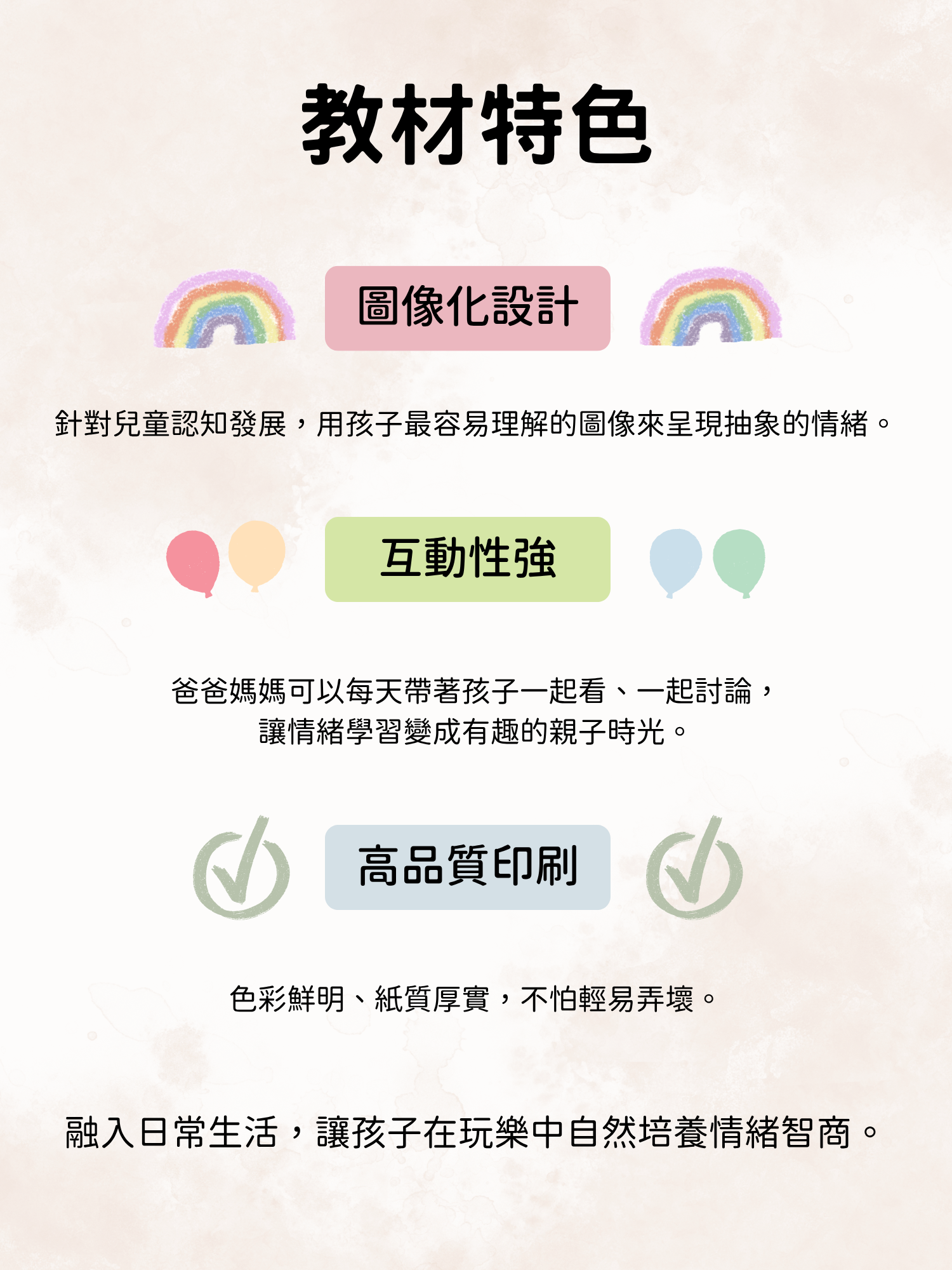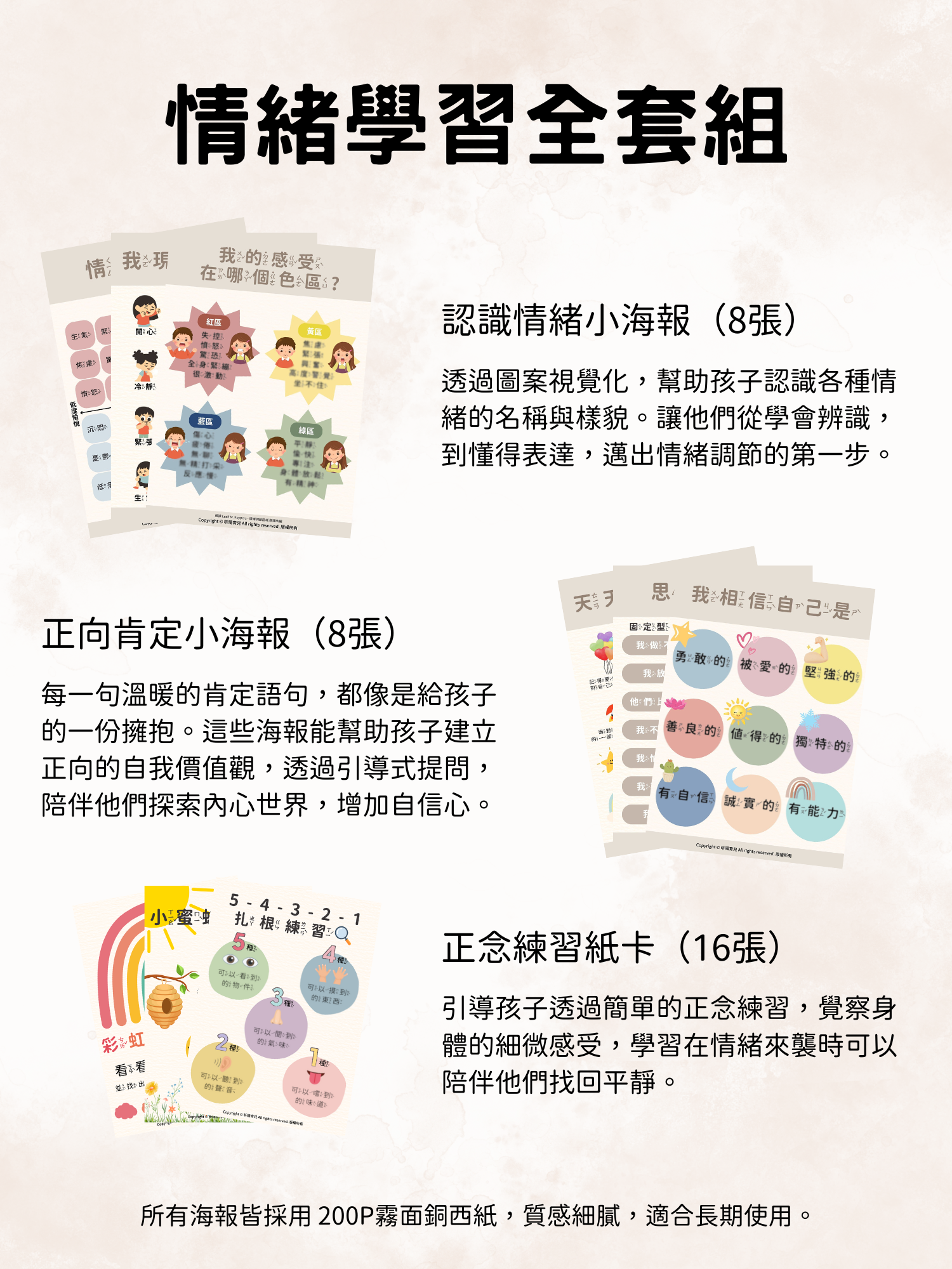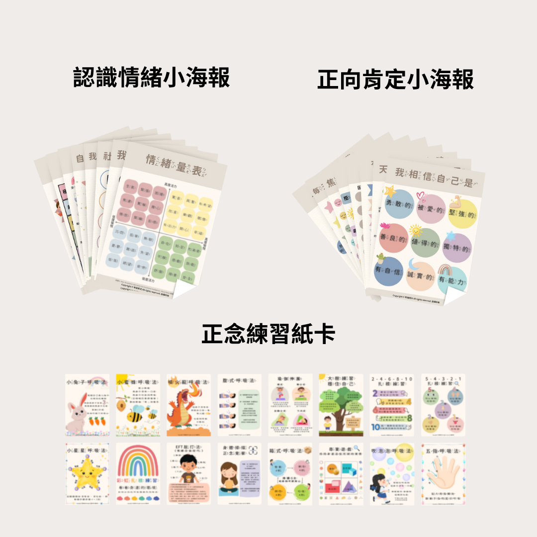 孩子可以透過教材認識、了解情緒,有正念練習小卡 可以引導孩子回到當下,專注呼吸 有效平靜高漲的情緒。也有情緒調節活動表 可以引導孩子在需要抒發情緒的時候可以怎麼做。幫助孩子提升自我覺察力,找到面對任何感受的與內在穩定力量🤍